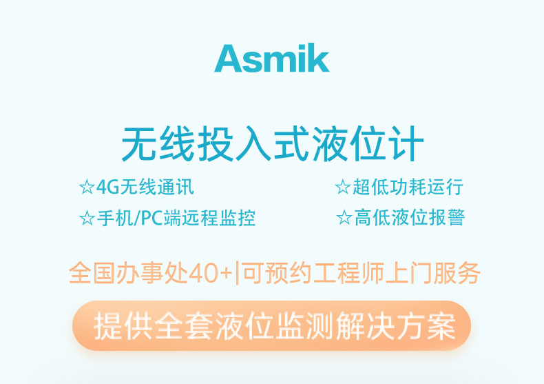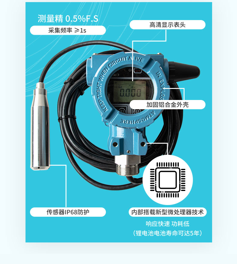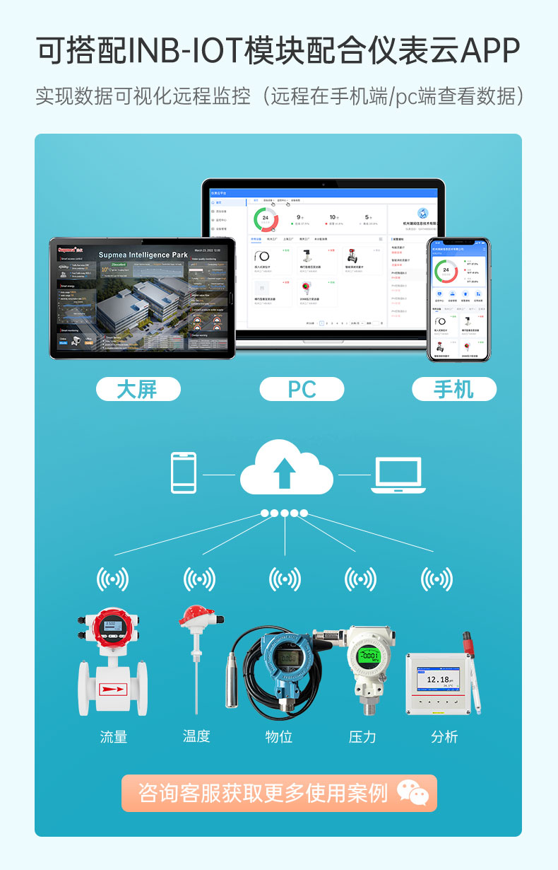 適用場合:無線投入式液位計是基于4G無線通訊網絡使液位的測量、變送、上報為一體的低功耗智能儀表,集成高靈敏度液位檢測元件,高精度信號調理電路,低功耗電池電源管理,豐富的LCD顯示界面于一體,周期性上報液位測量值、電池電量、信號質量等數據,并且能夠當液位超出設置范圍時及時報警,提前預警故障隱患。本產品適合油田、水利、消防管網、自來水管網、城市供熱管網等智慧城市應用場景。