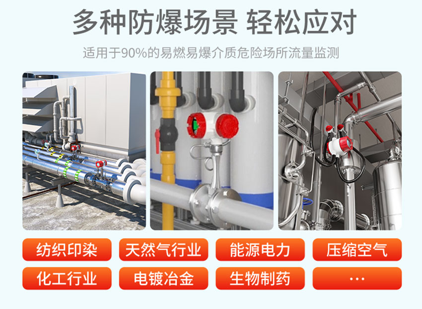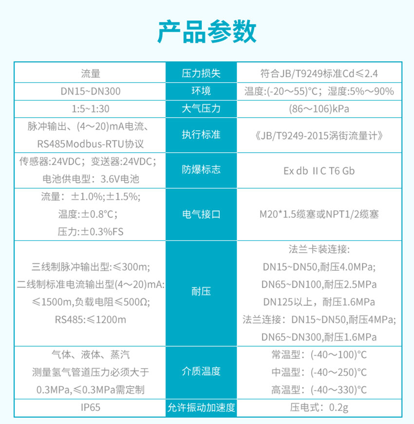 適用場合: 渦街流量計是一種應用卡門渦街原理的流量計,用于測量液體、氣體和蒸汽的流量,也可測量含有微小顆粒、雜質的渾濁液體,廣泛應用于石油、化工、制藥、造紙、冶金、電力、環保、食品等行業。